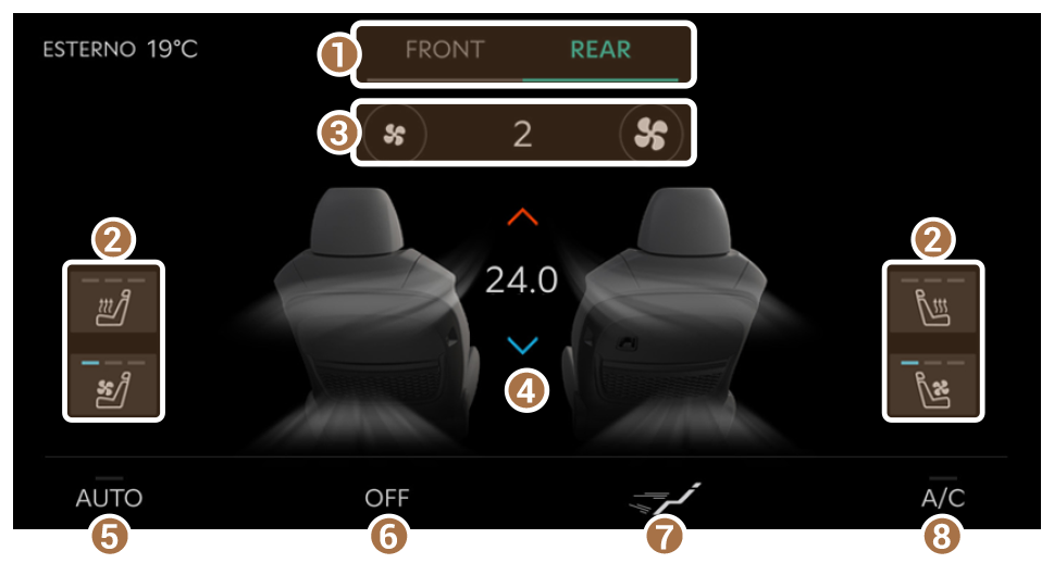 - Consente di visualizzare la schermata delle impostazioni di controllo clima dei sedili anteriori o posteriori.