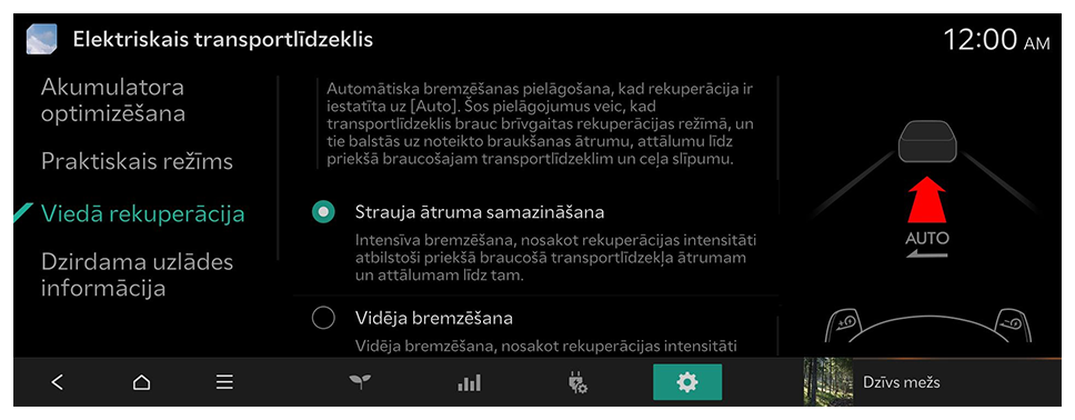 Automātiska bremzēšanas intensitātes regulēšana, ja rekuperācijas iestatījums ir [Auto]. Šīs korekcijas tiek veiktas, transportlīdzeklim braucot pa braukšanas trajektoriju, un to pamatā ir konstatētais braukšanas ātrums, attālums līdz vadošajam transportlīdzeklim un ceļa slīpums.