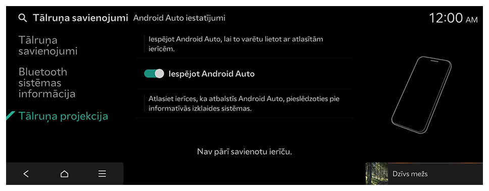 - Sākuma ekrānā pieskarieties pie Iestatījumi ► Tālruņa savienojumi ► Tālruņa projekcija ► Android Auto iestatījumi un pēc tam iespējojiet Iespējot Android Auto.