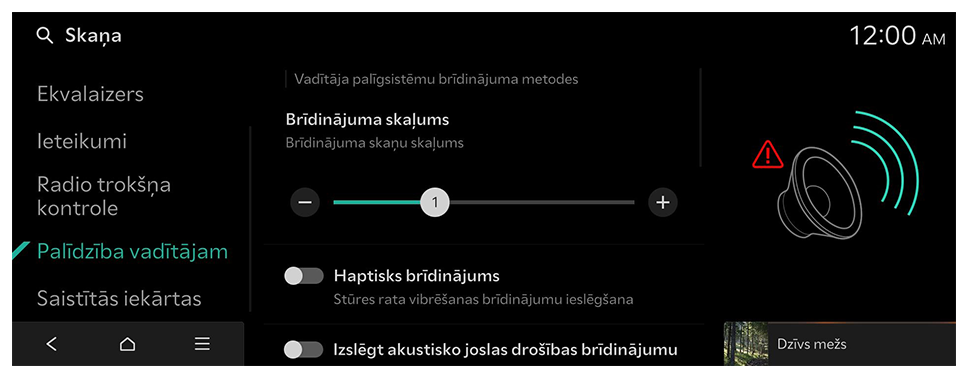 Automātiska audio skaļuma samazināšana, iedarbinot sistēmu, ja skaļums pārsniedz maksimālo pieļaujamo. Spēkā tikai tad, ja transportlīdzeklis noteiktu laiku ir bijis izslēgts.