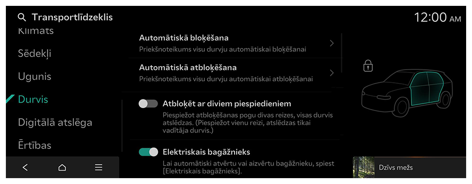 - Pieejamie iestatījumi var atšķirties atkarībā no transportlīdzekļa modeļa un specifikācijām. Papildinformāciju par šīm funkcijām skatiet automašīnas rokasgrāmatā.