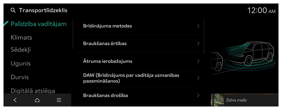 DAW (Brīdinājums par vadītāja uzmanības pazemināšanos) sistēmas iestatījumi.