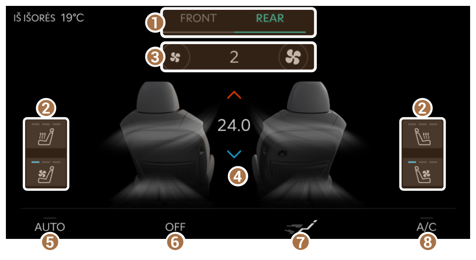 - Rodomas priekinių arba galinių sėdynių klimato kontrolės nustatymų ekranas.