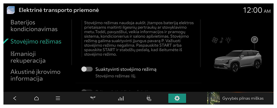 Stovėjimo režimas naudoja aukšt. įtampos bateriją elektros prietaisams maitinti ilgesnių pertraukų ar stovyklavimo metu.Todėl, pavyzdžiui, veikia informacijos ir pramogų sistema, kondicionierius ir salono apšvietimas. Stovėjimo režimą galima suaktyvinti įjungus pavarą P.