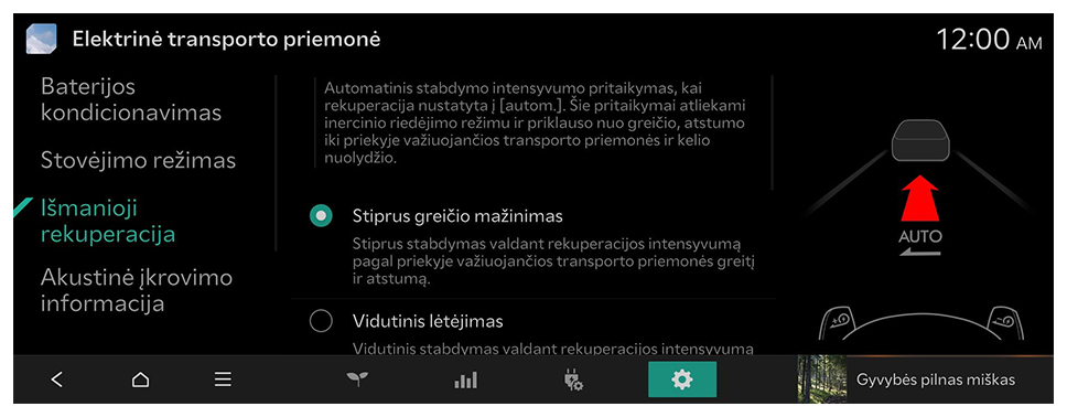 Automatinis stabdymo intensyvumo pritaikymas, kai rekuperacija nustatyta į [autom.]. Šie pritaikymai atliekami inercinio riedėjimo režimu ir priklauso nuo greičio, atstumo iki priekyje važiuojančios transporto priemonės ir kelio nuolydžio.