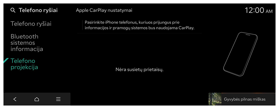 - Pradžios ekrane paspauskite Nustatymai ► Telefono ryšiai ► Telefono projekcija ► Apple CarPlay nustatymai.