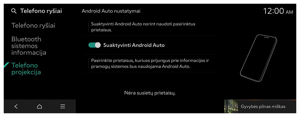 - Sėkmingai prijungus išmanųjį telefoną, Telefono projekcija pradžios ekrane persijungs į Android Auto. Jei nematote Android Auto, pabandykite prisijungti dar kartą.