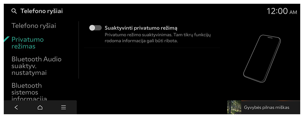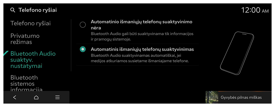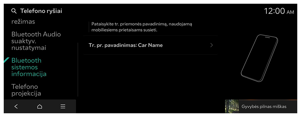 Tvarkykite „Bluetooth“ įrenginius arba konfigūruokite jų veikimo nustatymus. Taip pat galite įjungti telefono projekciją, kad galėtumėte valdyti išmaniojo telefono programėlę sistemos ekrane, prijungę išmanųjį telefoną prie sistemos.