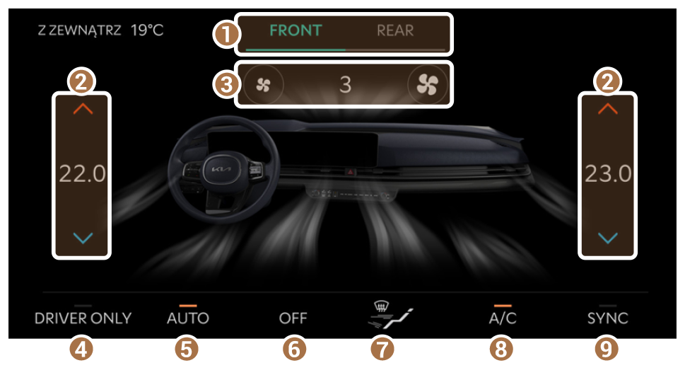 - Wyświetl ekran ustawień klimatyzacji na przednim lub tylnym siedzeniu.