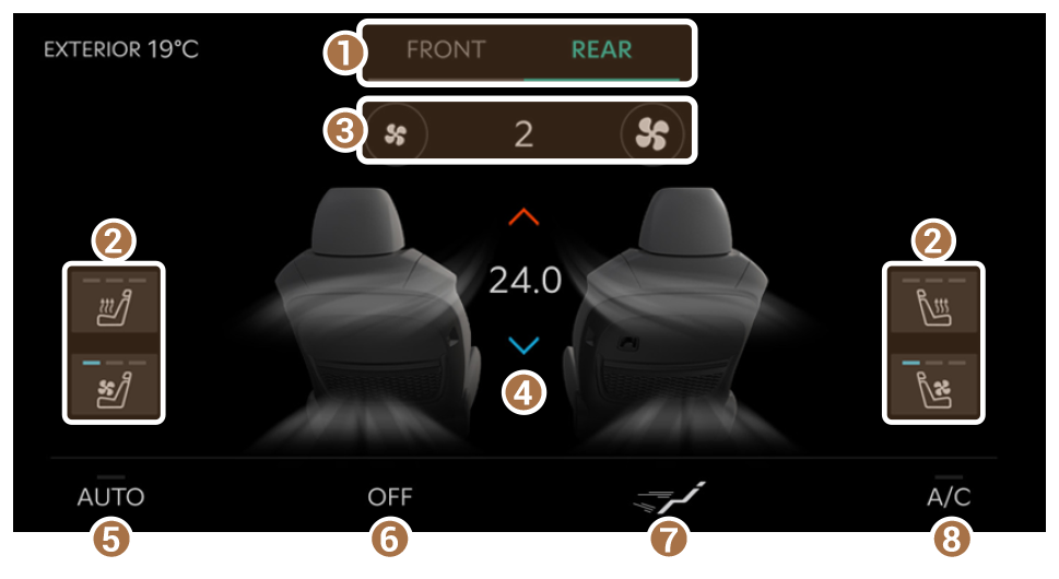 - Exiba o ecrã de definições do controlo da climatização do banco dianteiro ou do banco traseiro.