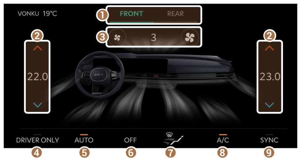 - Zobrazenie obrazovky s nastaveniami klimatizácie na predných alebo zadných sedadlách.