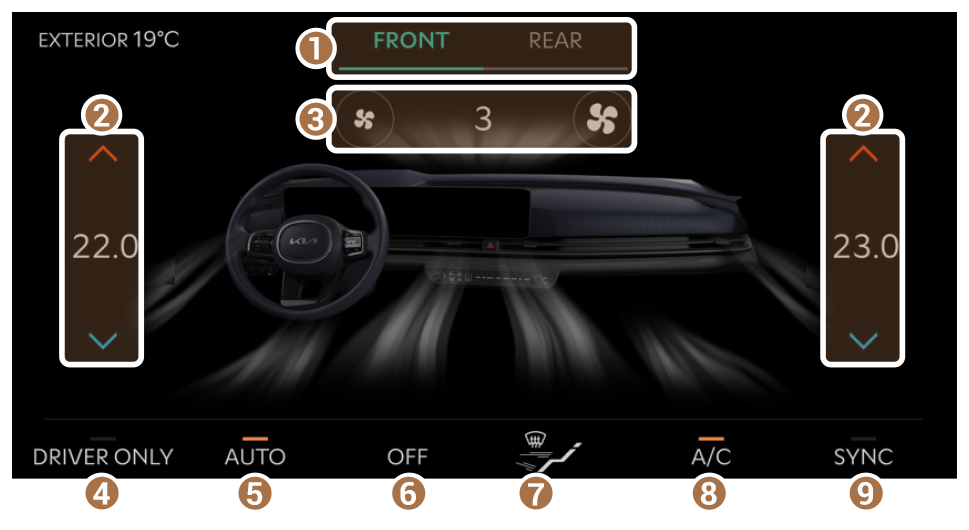 - Muestra la pantalla de ajustes de control de climatización de los asientos delanteros o traseros.