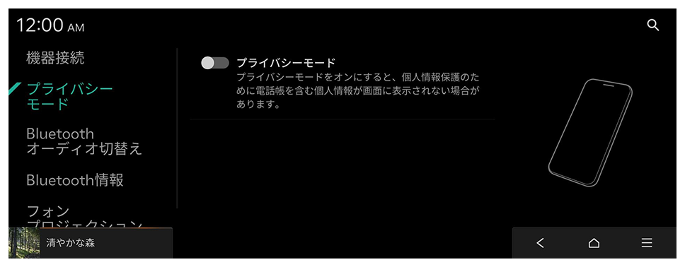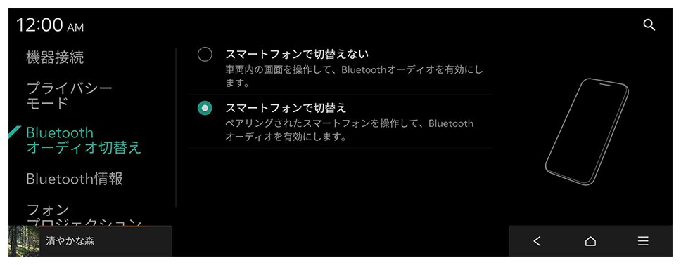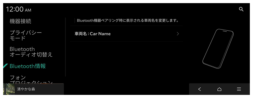 Bluetooth機器の管理および使用環境を設定します。また、システムとスマートフォンを接続してシステム画面でスマートフォンのアプリを操作可能にするために、フォンプロジェクション機能を有効できます。
