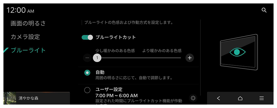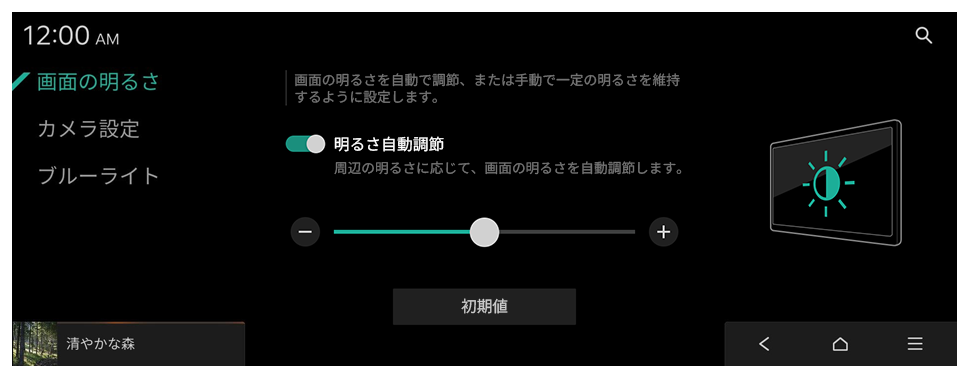 画面の明るさを自動で調節、または手動で一定の明るさを維持するように設定します。