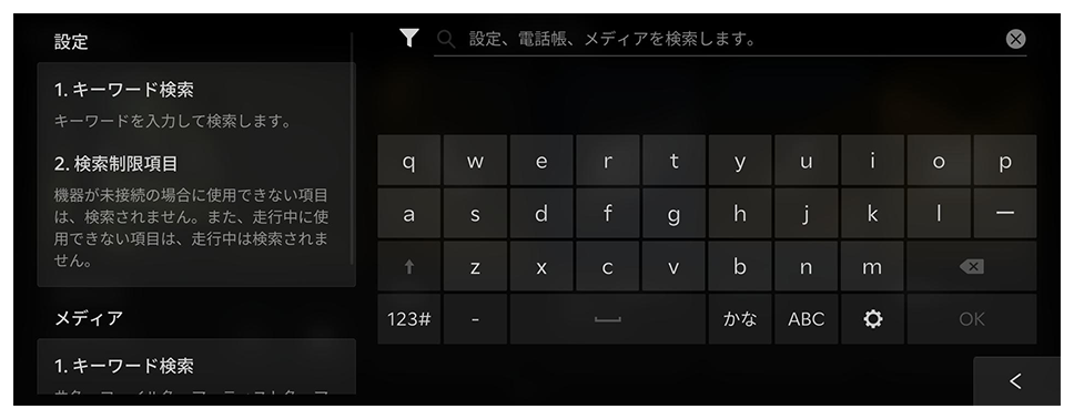 を押して特定の情報を検索できます。 - 検索結果は、表示されているメニューの順序や各モードの情報に基づいて表示されます。