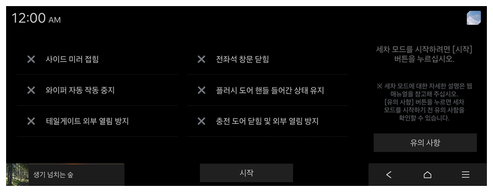 : 세차 모드가 실행되면 모든 차문이 자동으로 닫힙니다. 세차 모드가 종료되더라도 창문은 닫힌 상태로 유지합니다.