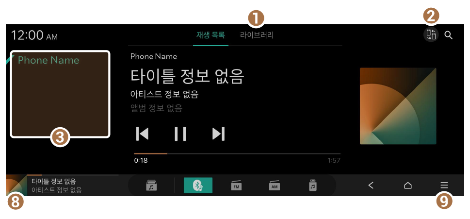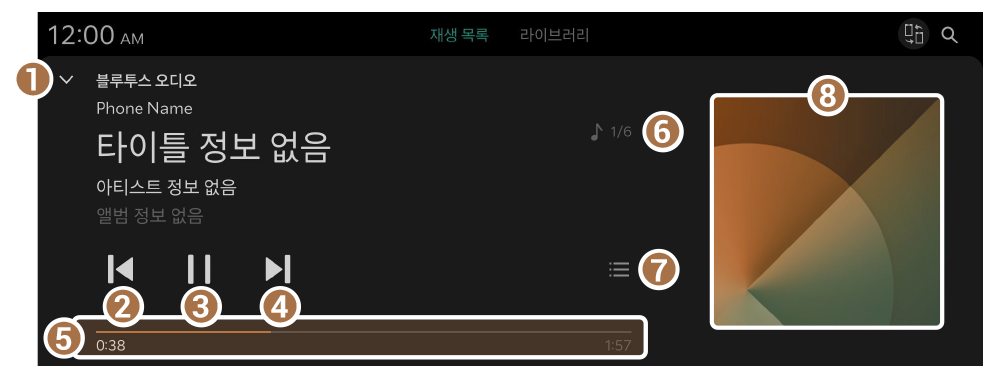 - 연결된 블루투스 기기나 휴대 전화에 따라, 또는 사용하는 뮤직 플레이어 앱에 따라 조작 방법 및 화면이 다를 수 있습니다.