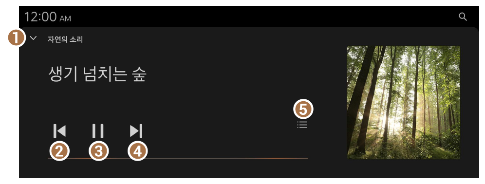 운전자의 긴장을 완화하고 편안하게 주행할 수 있도록 빗소리, 파도 소리 등 자연의 소리를 선택해 재생할 수 있습니다.