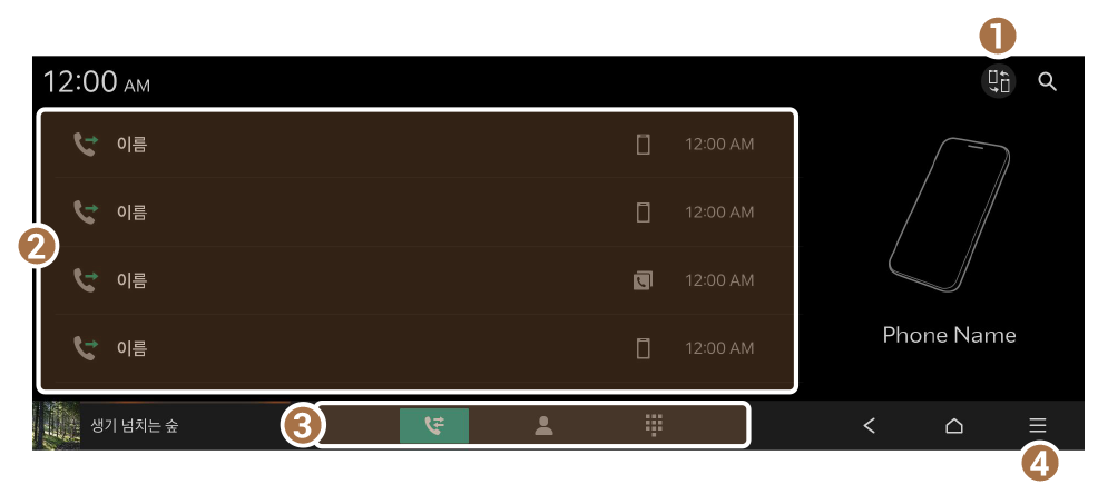 - 스티어링 휠의 이동 버튼을 사용하여 최근 통화 목록을 스크롤할 수 있습니다. 원하는 연락처를 눌러서 선택하세요.
