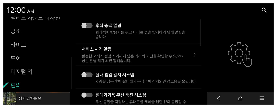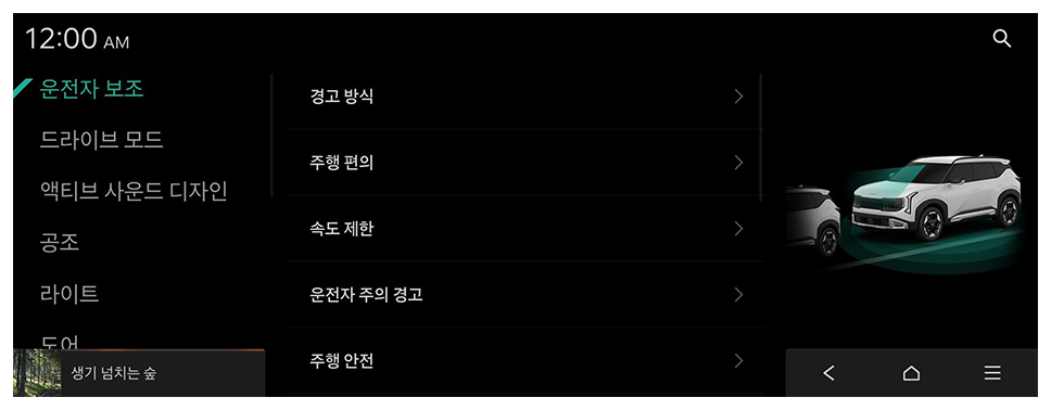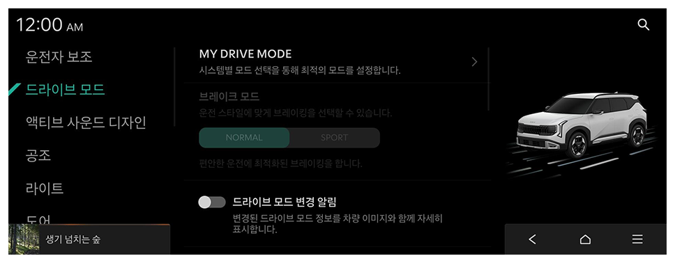 - 어두운 곳 주행 시 밝기 낮춤: 주행 중 어두운 곳에 진입하면 실내 무드 조명 밝기를 자동으로 낮춥니다.
