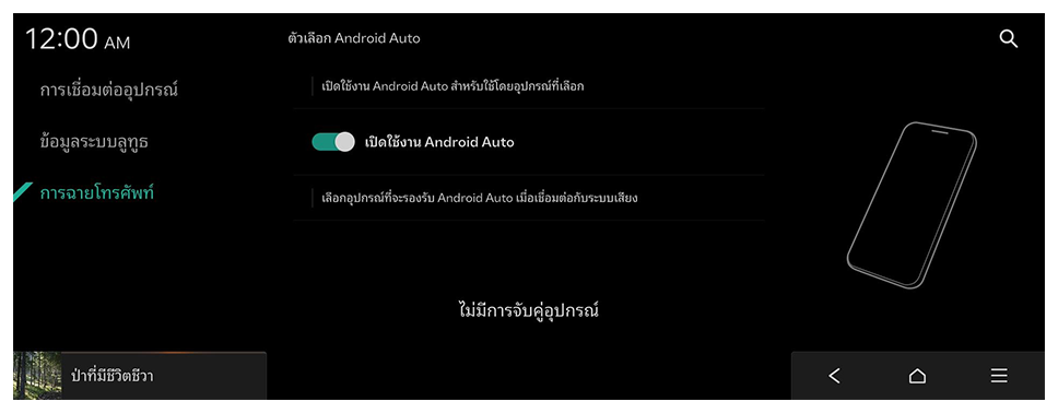 - เมื่อสมาร์ทโฟนเชื่อมต่อสำเร็จ การฉายโทรศัพท์ จะสลับเป็น Android Auto บนหน้าจอหลัก หาก Android Auto ไม่ปรากฏ ให้ลองเชื่อมต่ออีกครั้ง