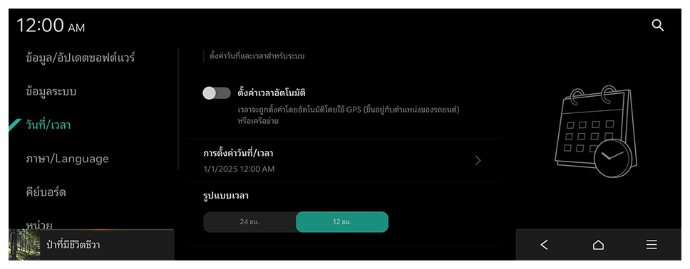 เวลาจะถูกตั้งค่าโดยอัตโนมัติโดยใช้ GPS (ขึ้นอยู่กับตำแหน่งของรถยนต์) หรือเครือข่าย